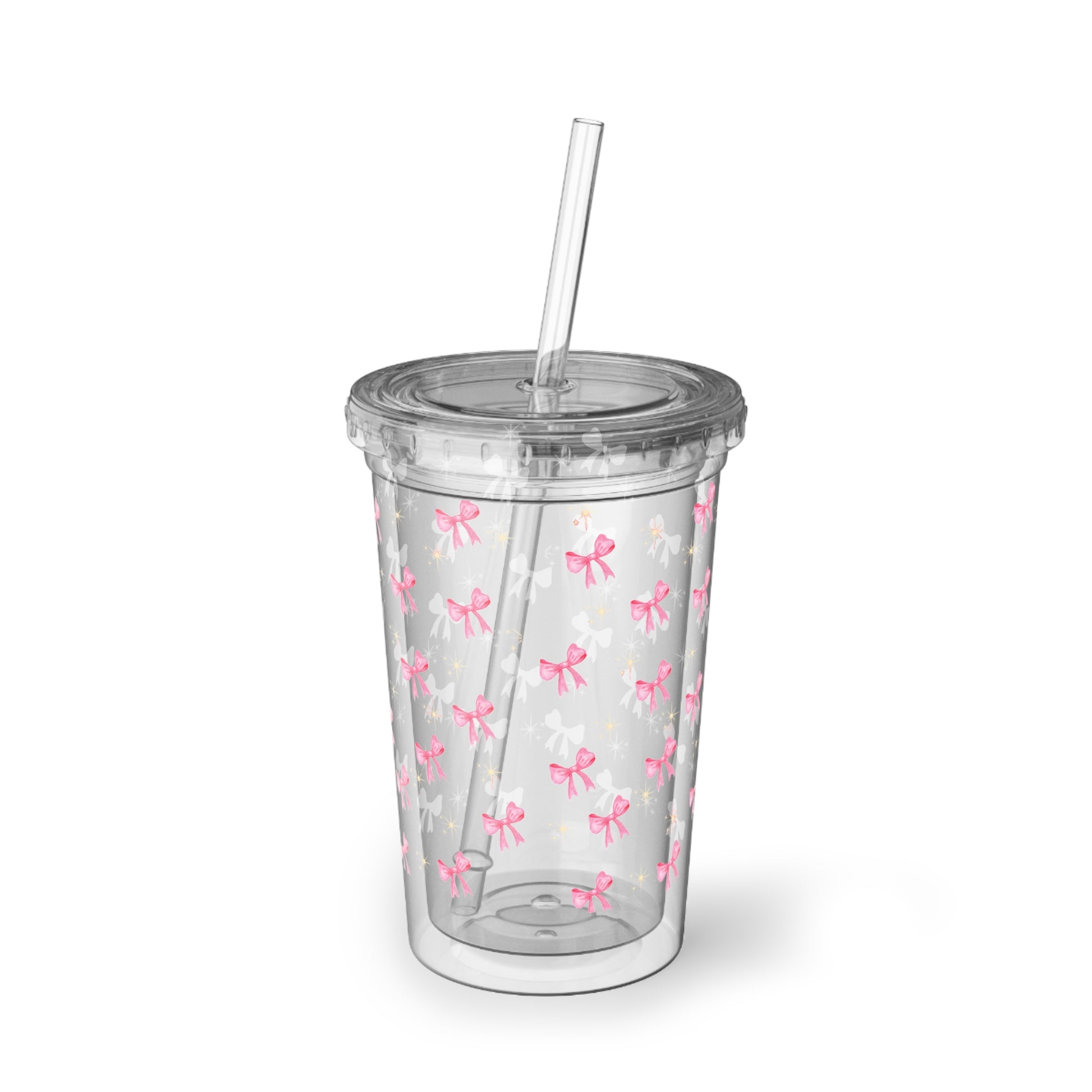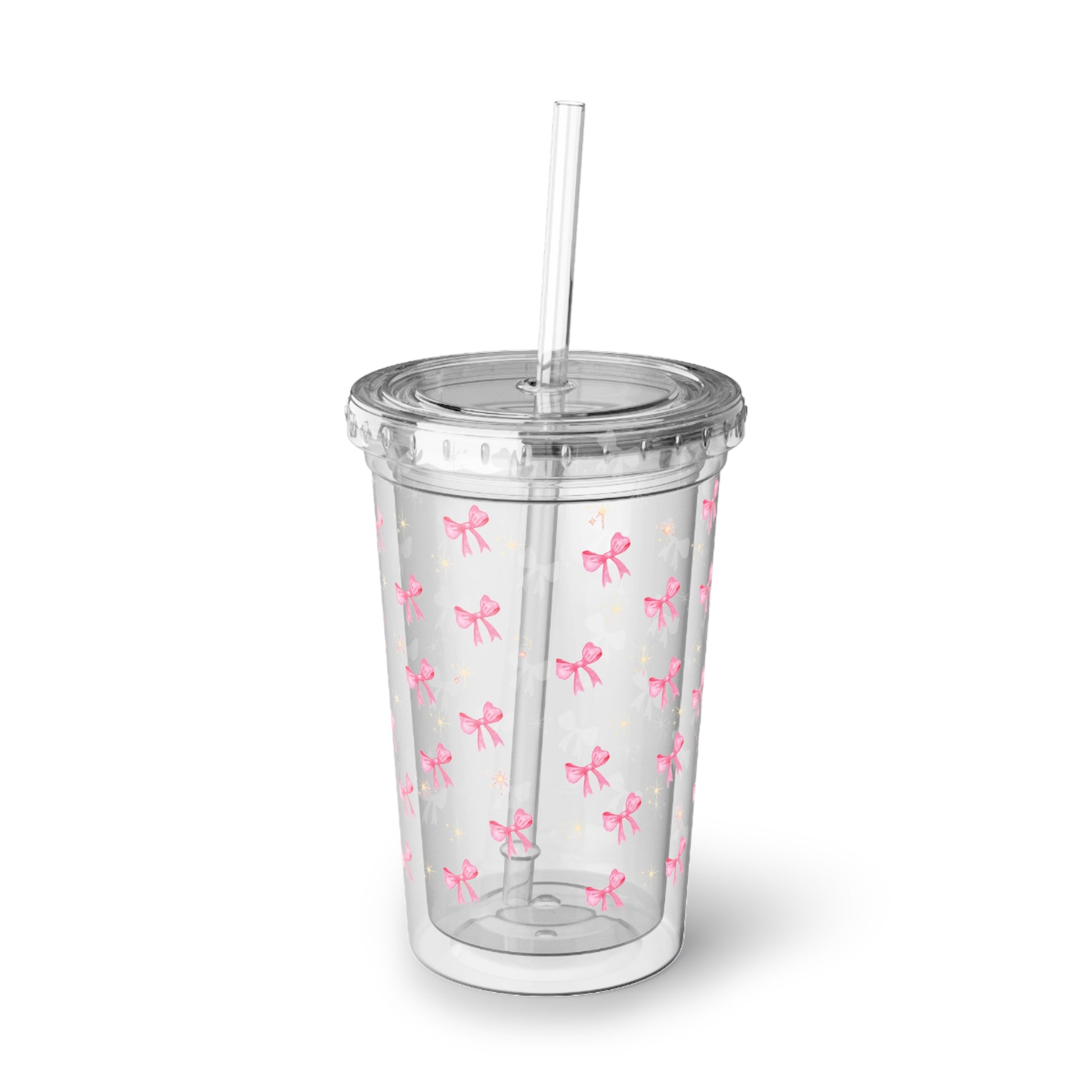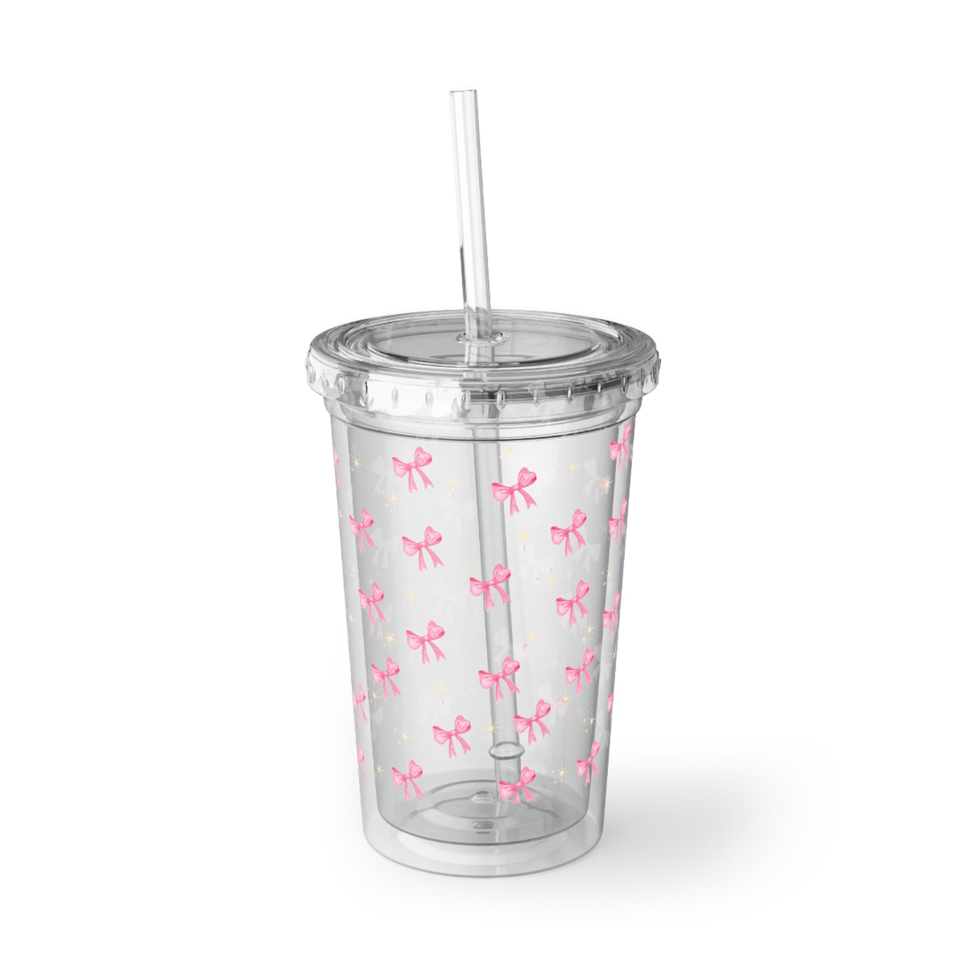 This 16oz double-wall acrylic cup brings a light, playful energy to your everyday routine. Clear, durable acrylic houses a repeating pattern of soft pink bows that peek through the insulated space, giving drinks a floating, dimensional look. The secure plastic lid and straight straw make sipping on the go effortless, while the BPA-free construction keeps things safe. It holds both cool iced drinks and warmed beverages without condensation or quick temperature loss, so your refreshment stays exactly how you like it. Carry it to study sessions, desk days, or casual outings — a small, charming statement in a practical everyday piece.